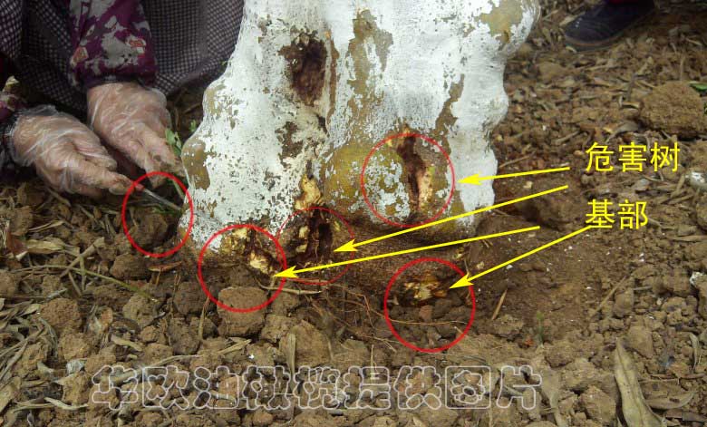 二是,树基部发现时,可用小铲或刀的背面在大粒横沟象已经危害的油橄榄树干基部刮除坏死树皮部位,施用氧化乐果液或辛硫磷乳油喷雾和灌根,或用刀砍基部树皮后施药,后覆土至砍开树皮部位以上,以便培养新的树根;